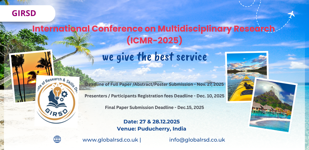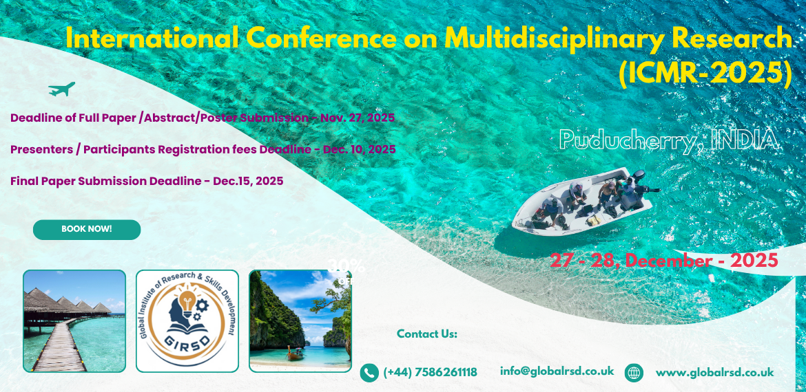 Full paper submissions or abstracts are invited for the International Conference on Multidisciplinary Research (ICMR-2025) to be held physically at Puducherry, India from 27th to 28th December 2025. The conference is being organised by the Global Institute of Research and Skills Development in association with Vision Pacific, Puducherry. This is an exceptional platform for researchers, academics, students, innovators, scientists and industry practitioners to discuss current research which is shaping a new world society. This conference will be a good platform to share research, innovations and best-practices where constructive feedback and engagement with domain experts is expected. Many topics of the multi-disciplinary nature as a response to everyday challenges faced in both developing and developed world contexts will be discussed. We encourage submissions of cross-disciplinary nature cutting across many disciplines/subject-areas. We encourage any submissions that present novel ideas, works-in-progress or any concepts that you think can benefit from inputs from experts. Students and/or emerging researchers are encouraged to participate.